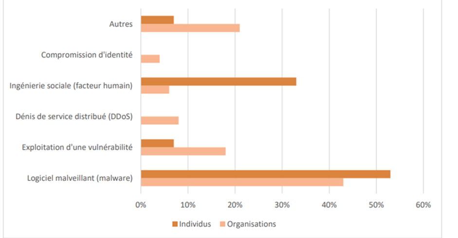 Ci-dessous, une illustration qui met en lumière les types d’attaques numériques en Afrique de façon générale dans les entreprises, les institutions et les particuliers. Cette illustration nous permet de comprendre l’enjeu qu’implique le capital humain dans les questions de cyberattaques.